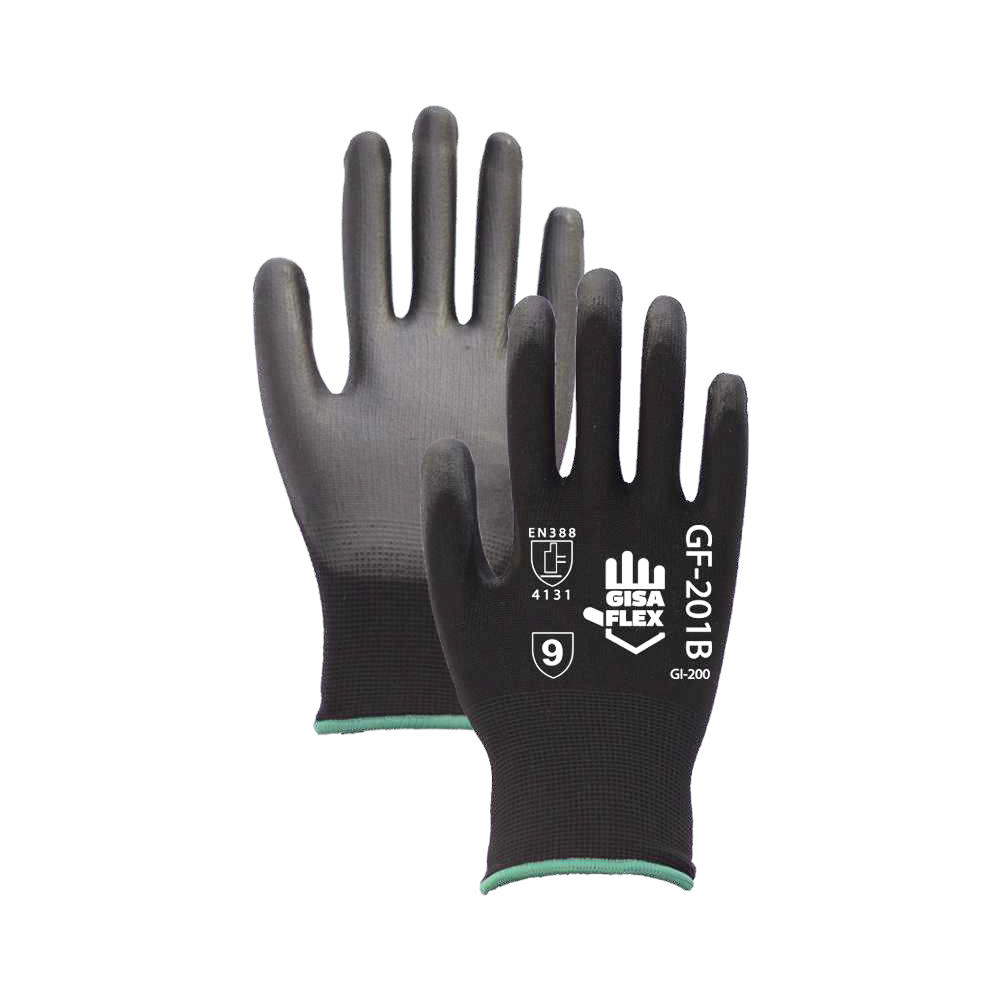 GUANTE TEJIDO DE POLIESTER GISA FLEX GF-201B NEGRO CON PALMA DE POLIURETANO TALLA 10