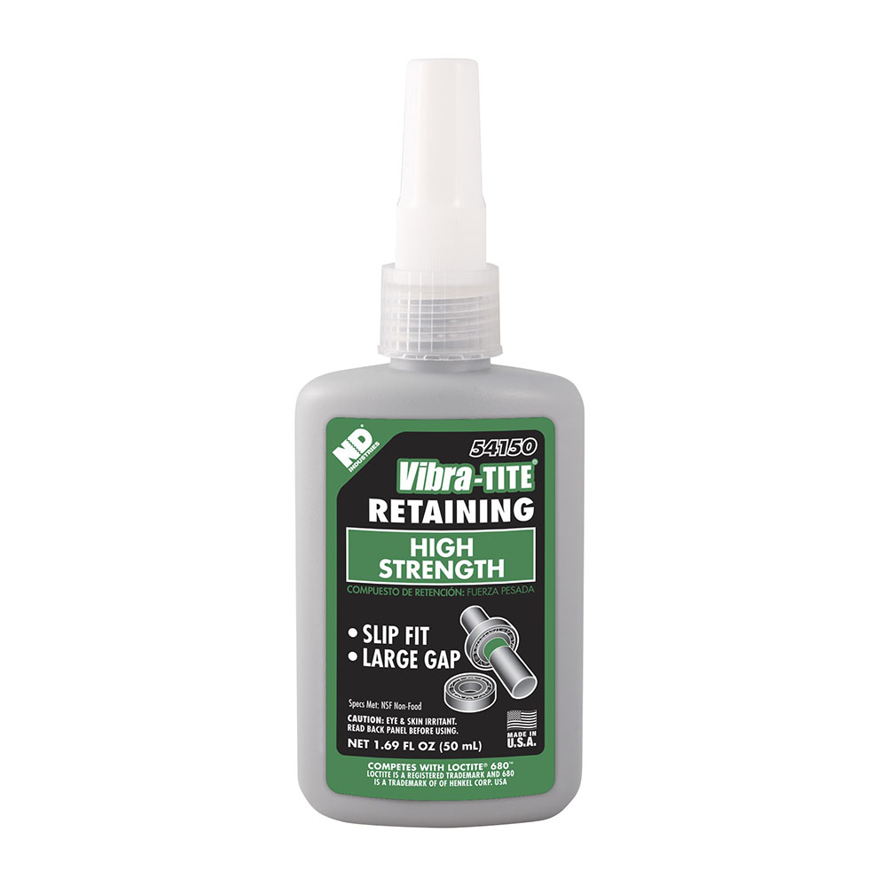 - Compuesto de retención de alta resistencia Vibra-Tite 541 que cura a temperaturas ambientales rellenando separaciones diametrales de hasta 0.015”. Entre otros usos típicos Entre otros usos típicos se incluyen piezas cilíndricas que reemplazan tornillos de presión, anillos de sujeción y anillos de presión. Proporciona un esfuerzo de cizalla mayor que 3,000 psi después de 24 horas con un tiempo de secado de 10 minutos.