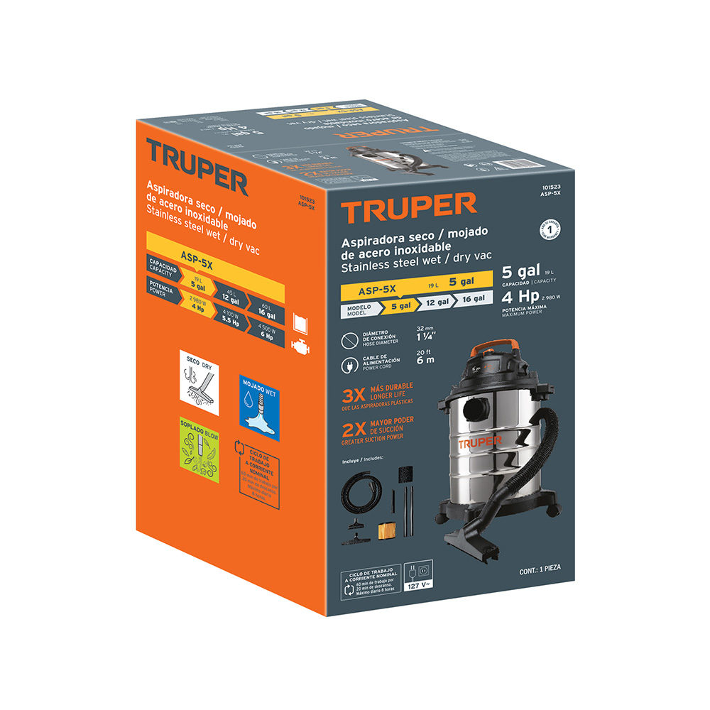 ASPIRADORA INDISTRIAL DE ACERO INOXIDABLE DE LIQUIDOS Y SOLIDOS TRUPER ASP-5X CAPACIDAD DE 19 L
