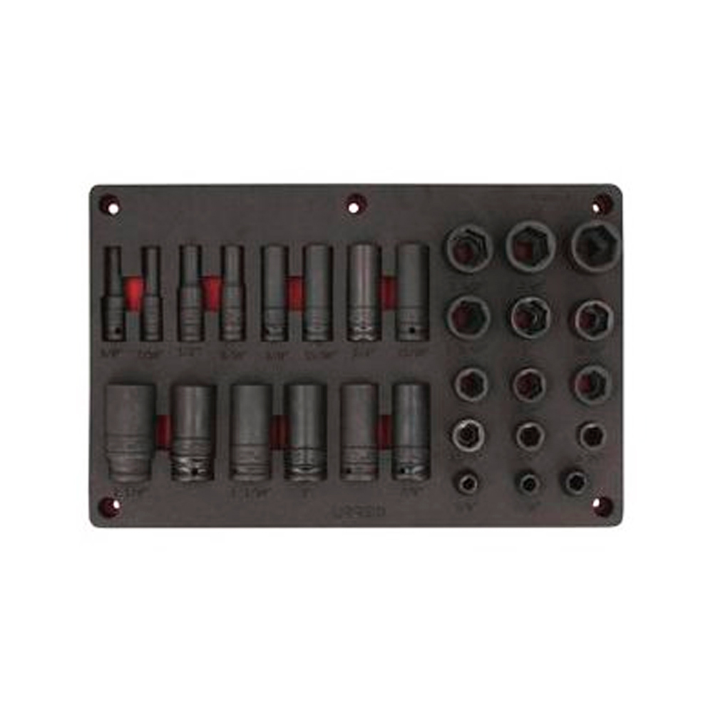- Juego de dados de impacto largos cuadro de 1/2″, en pulgadas, con bandeja de espuma EVA diseñada para fijarla en la pared, manteniendo la herramienta en su lugar aunque este en posición vertical. -Normal y largo, 6 puntas, estándar.
