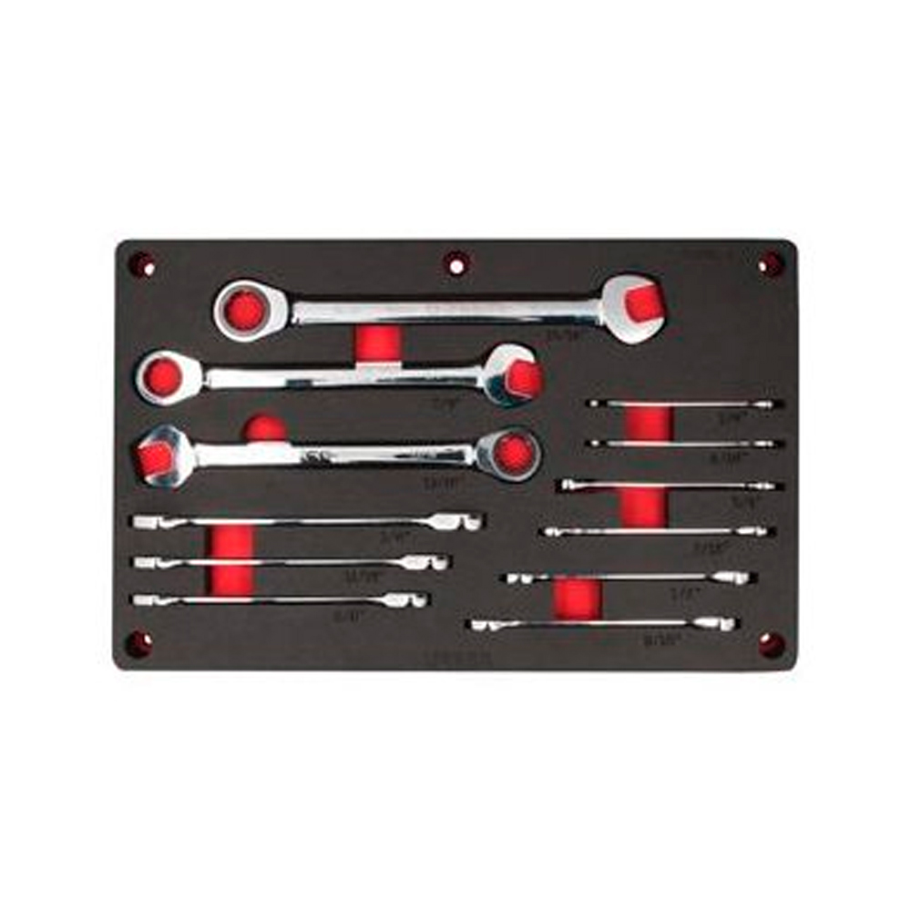 - Juego de llaves combinadas tipo matraca, pulgadas, pulido espejo, con bandeja de espuma EVA diseñada para fijarla en la pared, manteniendo la herramienta en su lugar aunque este en posición vertical