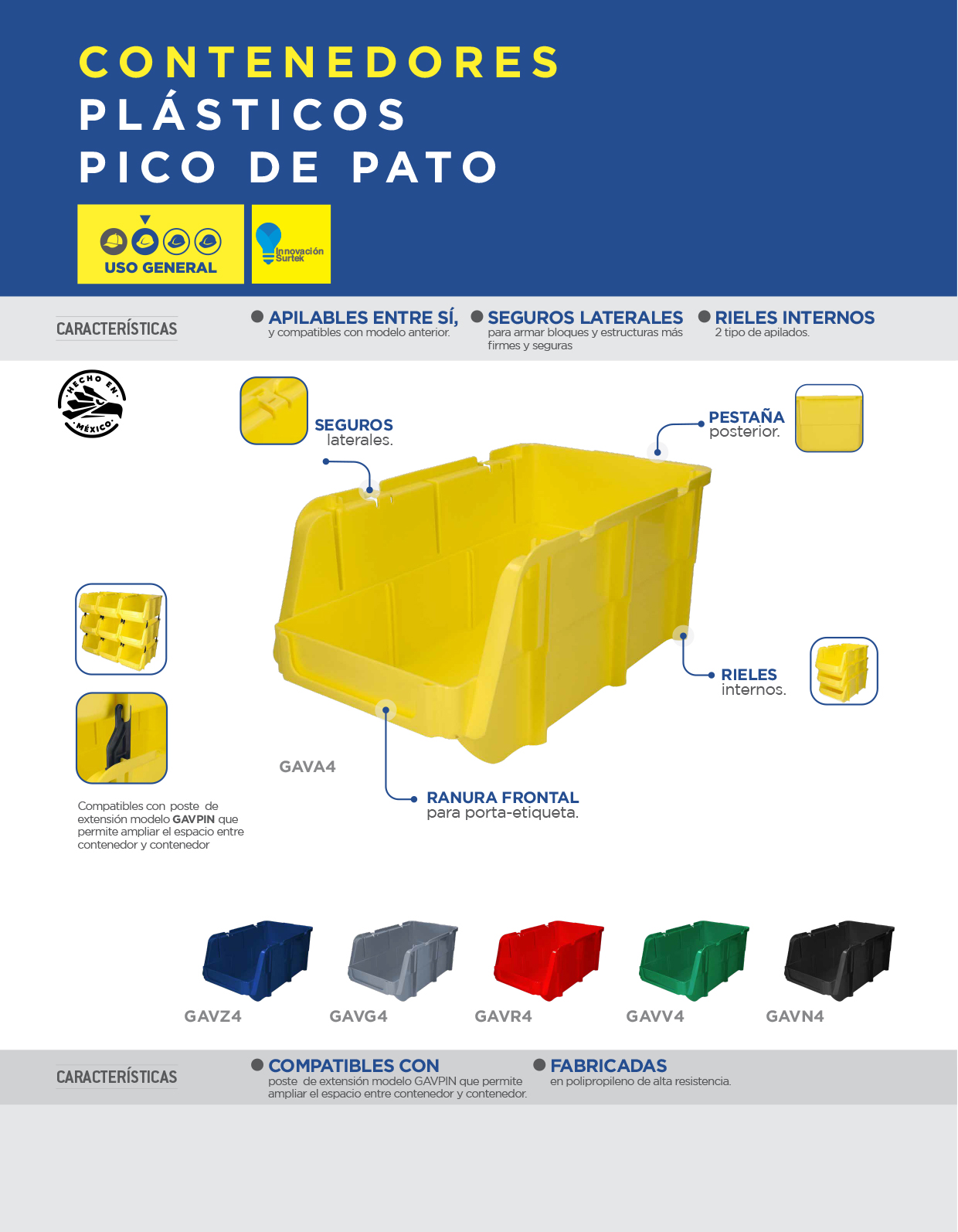 - Apilables entre sí, rieles internos para 2 tipos de apilado.