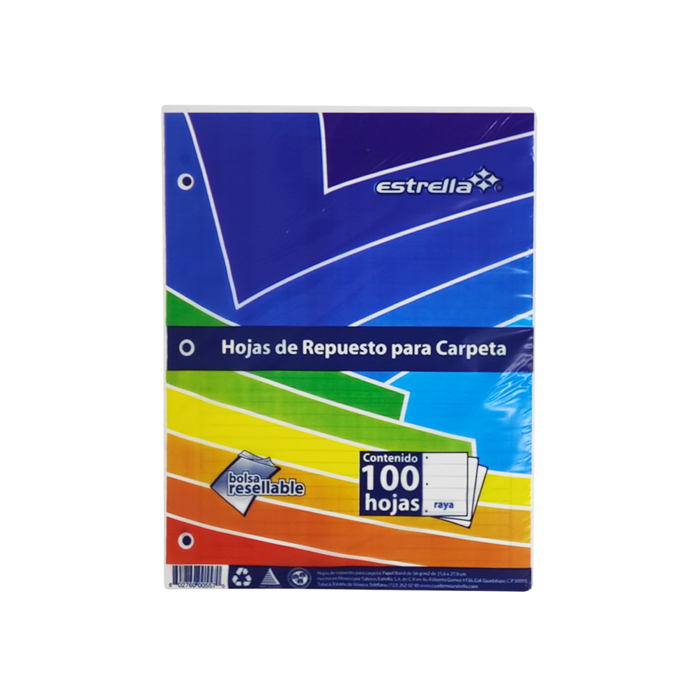 HOJA DE PAPEL ESTRELLA 0557 PAQUETE CON 100 PIEZAS RESPUESTO PARA CARPETA TAMAÑO CARTA RAYA
