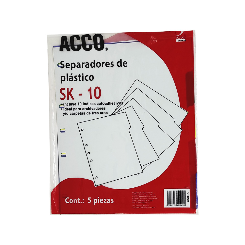 SEPARADOR PARA CARPETA DE PLASTICO ACCO WILSON JONES P0560 CON 5 PIEZAS SK10