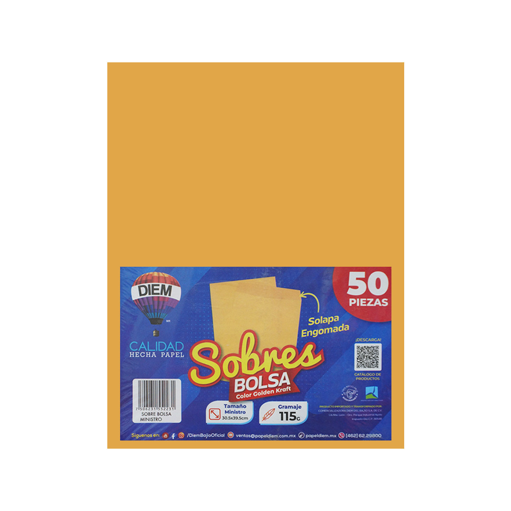SOBRE DIEM BOLSA TAMAÑO MINISTRO LEGAL 115 GRAMOS 30.50X39.50 CENTÍMETROS ENGOMADO PAQUETE 50 PIEZAS