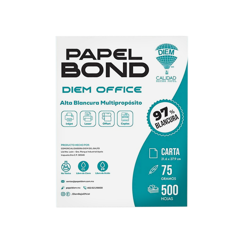 HOJA DE PAPEL BOND DIEM BOND BCO PAQUETE 500 PIEZAS TAMAÑO CARTA 97% BLANCURA 21.6X 27.9 CENTIMETROS